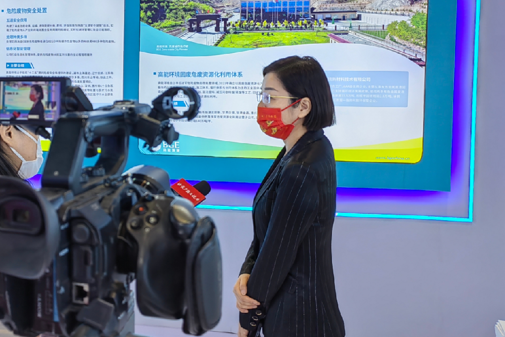 高能環(huán)境公共事務(wù)中心副總監(jiān)鄧靈燕在展區(qū)接受北京電視臺(tái)采訪