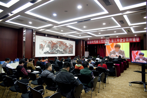 本次視頻講座教授為中央黨校報社社長、博士生導師謝春濤,圍繞學習貫徹黨的十八屆三中全會精神特別是《中共中央關于全面深化改革若干重大問題的決定》,為公司員工進行了深入解讀。謝教授緊緊圍繞《決定》中明確的十五個方面內容,用獨到的見解逐一對《決定》中體現出的改革的緊迫性、深刻性、全面性做了深入、細致的解讀。對《決定》中體現的一些重點、難點、熱點和亮點問題,結合自身地方掛職的經歷進行了生動的闡述和說明。整場輔導會會場秩序井然、大家對照《決定》讀本認真做好記錄。通過此次學習,使我司廣大員工對三中全會精神的學習領會水平有了更進一步的提升,受到一致好評。